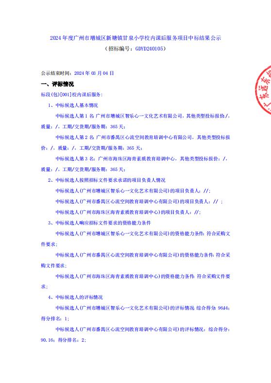 2024年度廣州市增城區(qū)新塘鎮(zhèn)甘泉小學(xué)校內(nèi)課后服務(wù)項目中標(biāo)結(jié)果公示
